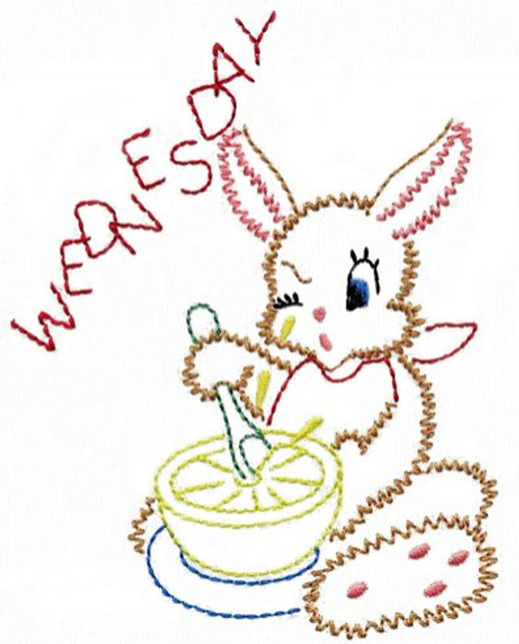 Decorate towels, napkins, aprons, pillows, bedroom linens, needlepoint canvas, quilt blocks, fabric, and more. These charming days of the week designs are a daily reminder of our domestic duties.