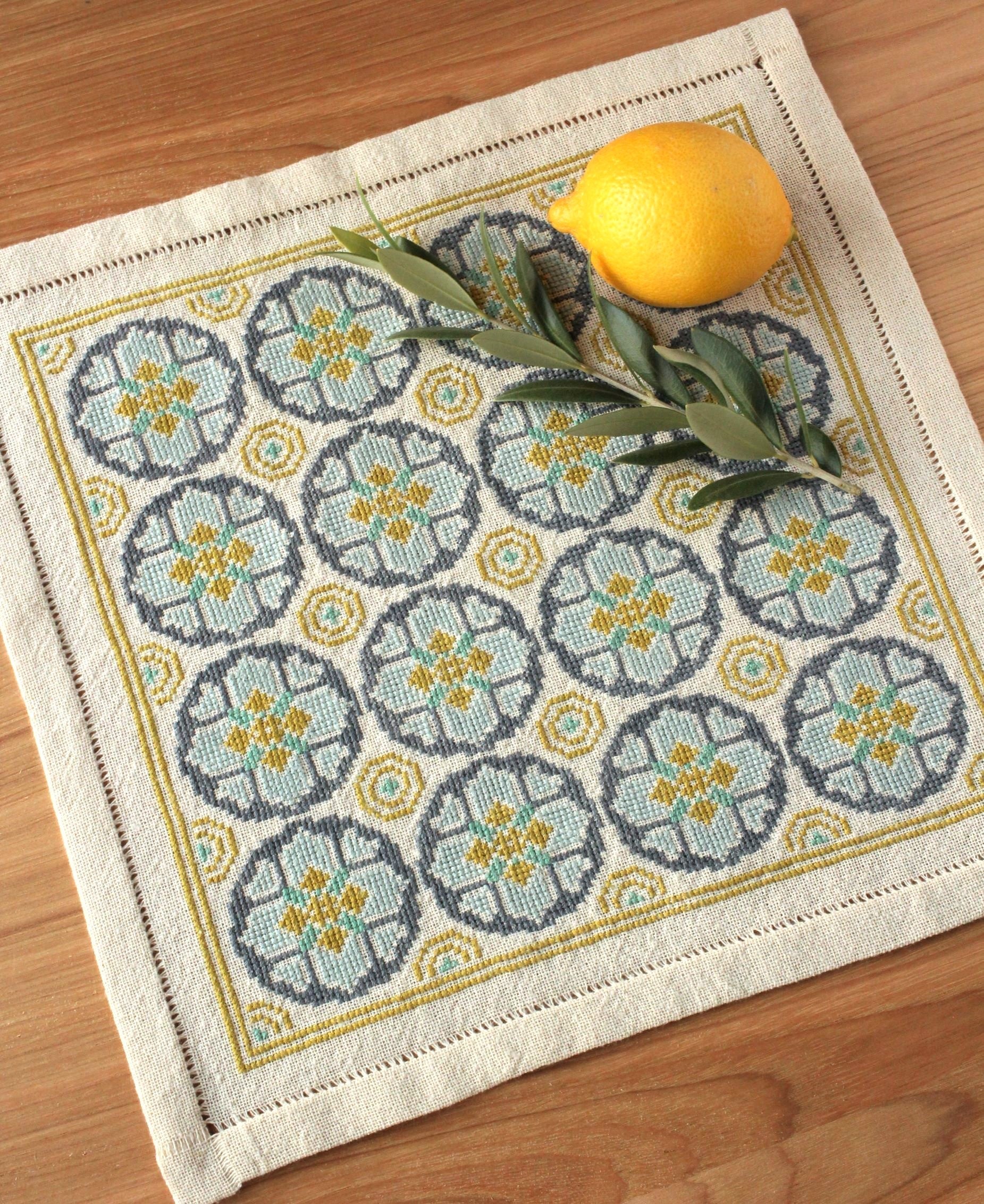 The Venetian Coins folk embroidery kit features a repeating geometric design that reminded me of coins made throughout the medieval world, often featuring cross designs. Worked in shades of pewter gray and olive green to mimic the metals from which old coins were minted, this design can be worked in the square arrangement as shown (nice for cushion covers or as a square table mat), or as a long table runner with a larger piece of cloth.