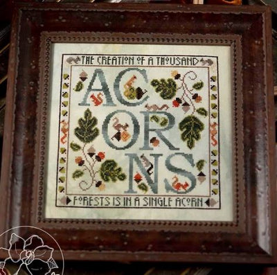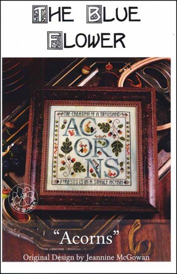 Acorns Cross Stitch Pattern by The Blue Flower Original Design by Jeannine McGowan. This design features a multitude of tiny squirrels and a lush fall thread palette.