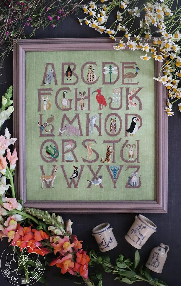Animal Alphabet Cross Stitch Pattern by The Blue Flower Original Design by Jeannine McGowan. Each letter includes an animal - some familiar and some more unusual. (There is a full 'cast of characters' list on the back of the chart.)