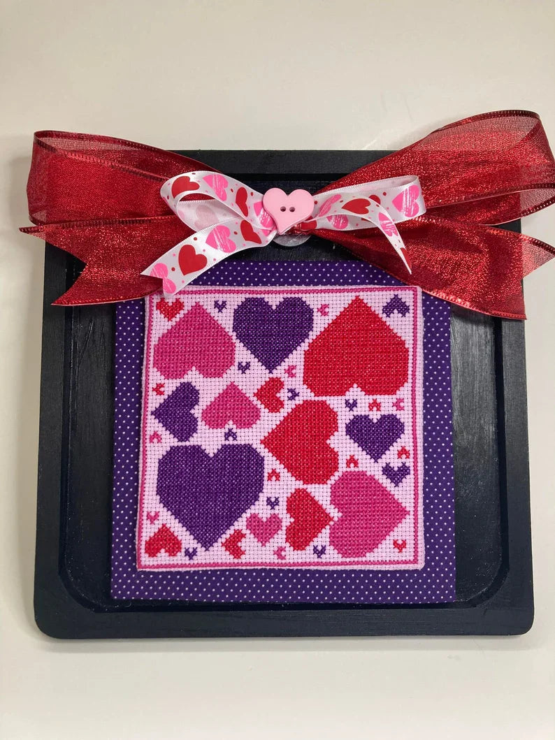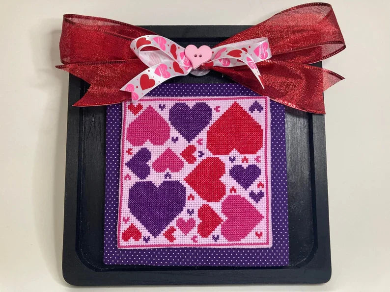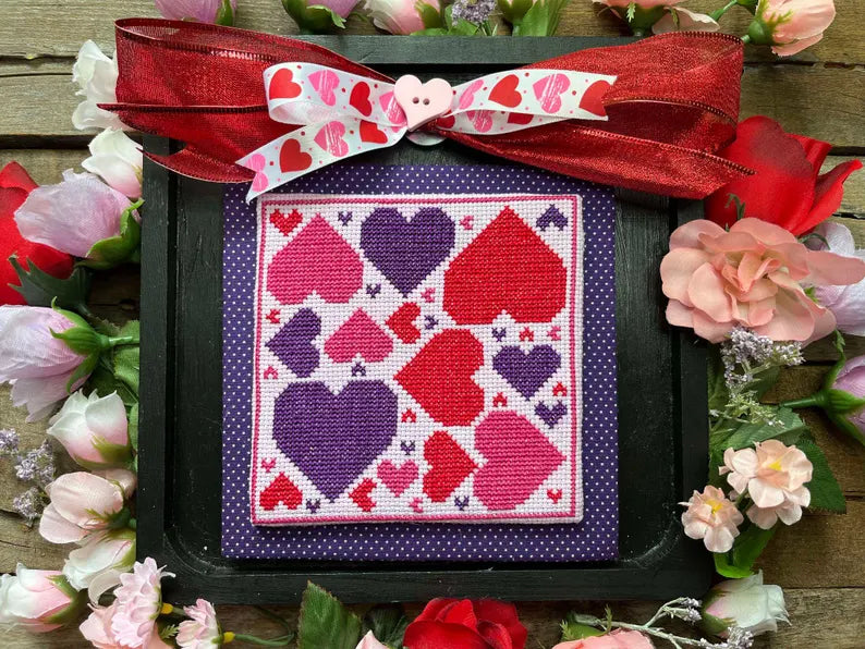 This charming cross-stitch pattern celebrates the season of love with a delightful stack of whimsical hearts in various patterns and shades of red, pink, and white. From polka dots to stripes to checks, these hearts are "piled up" in the sweetest, most playful way, creating a design that’s as cheerful as it is romantic.
