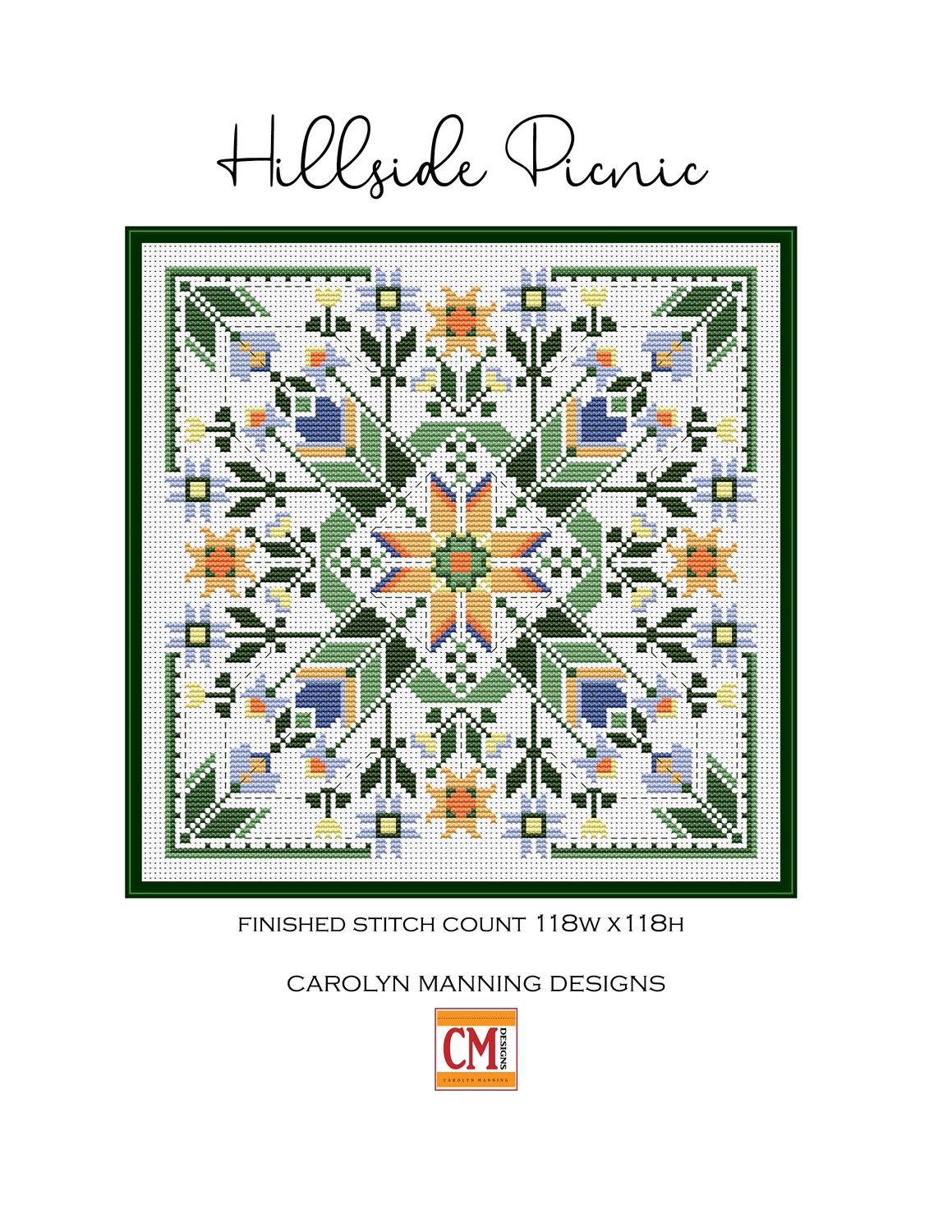 Enjoy a peaceful afternoon of stitching with Hillside Picnic by CM Designs. This charming geometric floral design feels like a gentle breeze across rolling hills, with soft greens, sky blues, sunny golds, and delicate accents arranged in a beautifully balanced square.