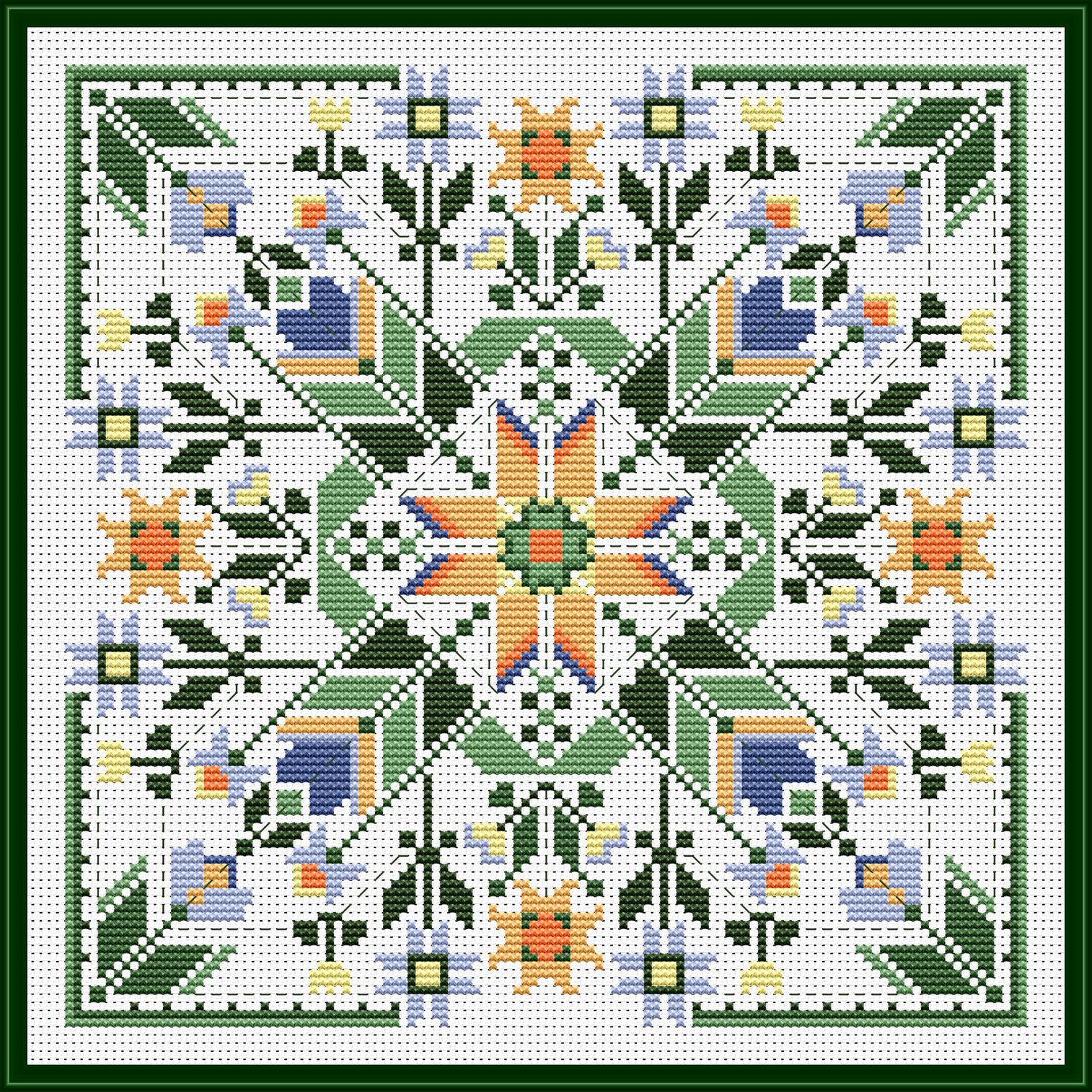 The design’s symmetry and lighthearted palette make it a joy to stitch, while its layered motifs evoke blankets spread on grass, wildflowers in bloom, and quiet moments shared outdoors. Hillside Picnic is a lovely choice for relaxed, feel-good stitching and timeless home décor.