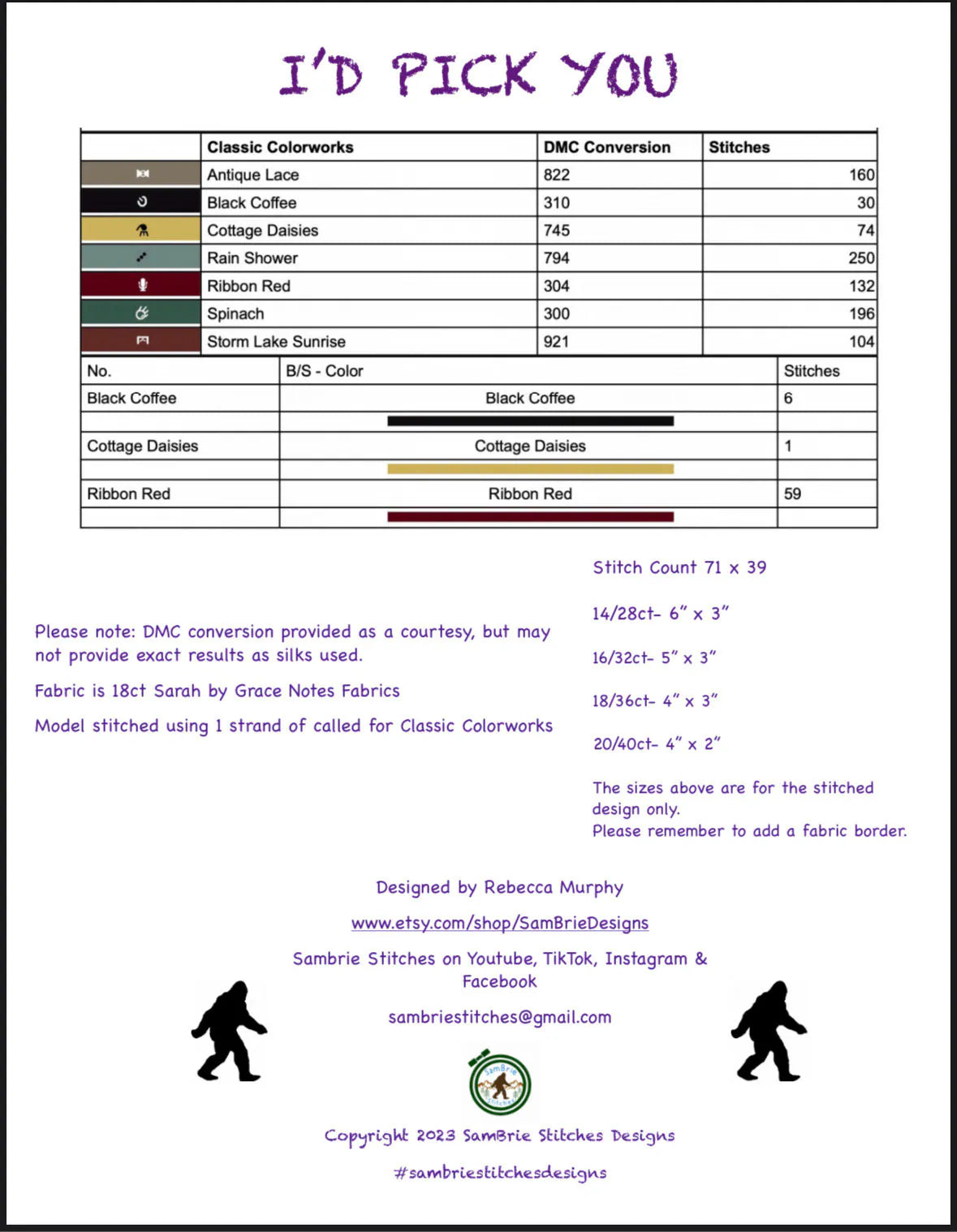I'd Pick You Counted Cross Stitch Pattern by SamBrie Stitches Designs.