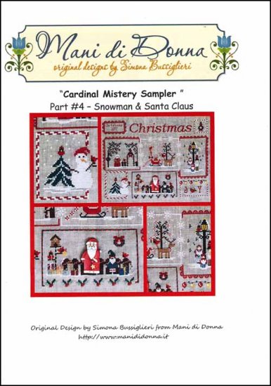 Cardinal Mistery Sampler Part #4: Snowman & Santa Claus Cross Stitch Pattern by Mani di Donna. What a fun design for Christmas featuring snowman by the tree and Santa Claus by his Christmas presents.