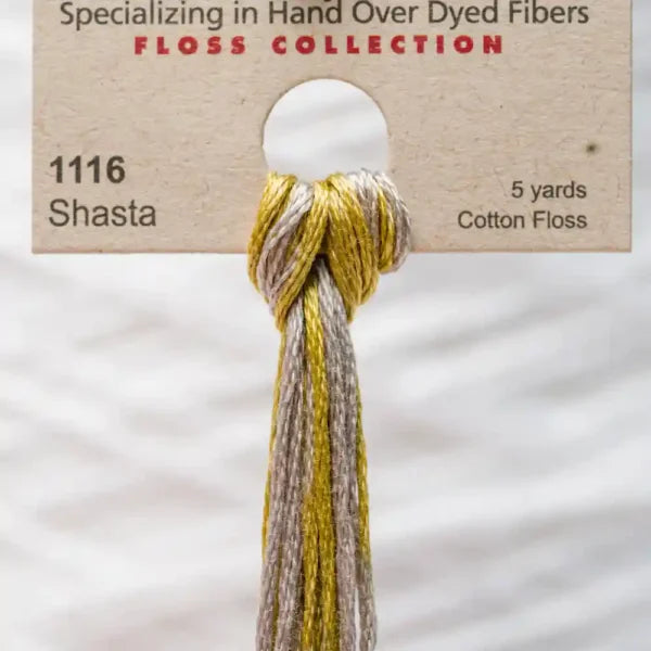 1116 Shasta Dye Works Floss is a hand-dyed, 6-strand, 100% cotton embroidery floss known for its rich, nuanced color variations. Each skein is individually dyed, resulting in subtle differences that add depth and character to stitched designs.