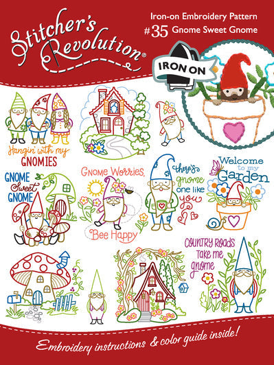 Stitcher's Revolution® Gnome Sweet Gnome SR35 Iron-On Embroidery Transfer Pattern.