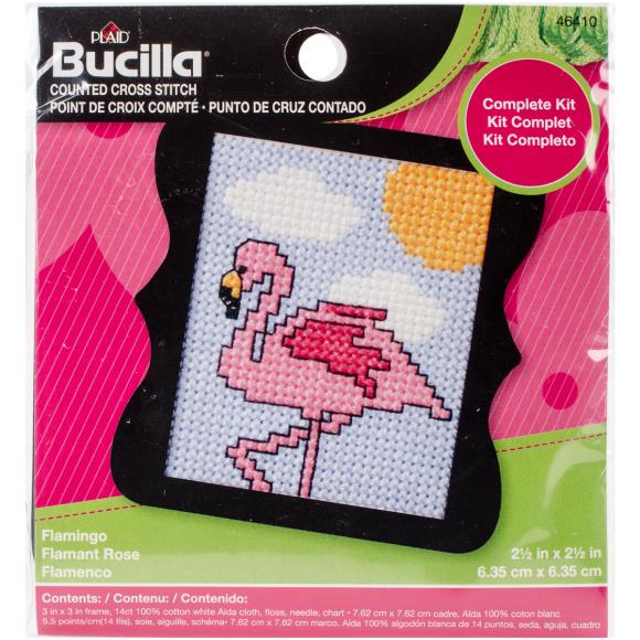 Flamingo Beginner Minis Counted Cross Stitch Kits by Bucilla®. Fun, quick, and straightforward, Bucilla's Beginner Minis makes learning to stitch a breeze. With their modern designs, lively color palette, and easy-to-follow instructions, these simple needlework projects are great for all ages and experience levels.