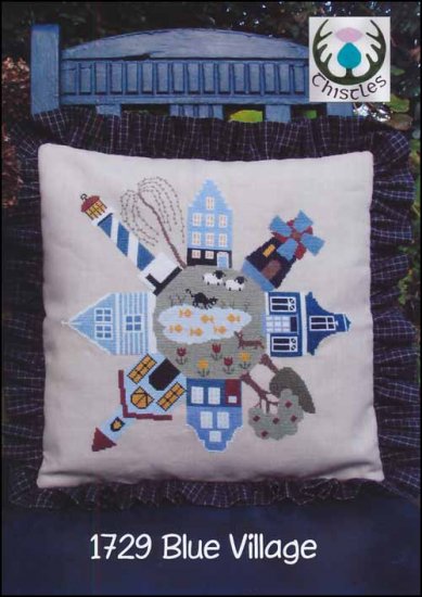 Blue Village Cross Stitch Pattern by Thistles. This adorable village has a small pond with fish, blooming flowers, sheep, a cat, and a dog in the middle. Stitched around the green space are blue structures making up a village. A lighthouse, a couple of churches, a windmill, etc.