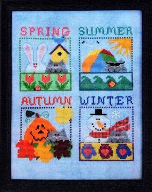 Celebrate the charm of every season with Kitty's Four Seasons by Val's Stuff! This delightful cross-stitch design features four whimsical panels, each showcasing the joys of spring, summer, autumn, and winter.