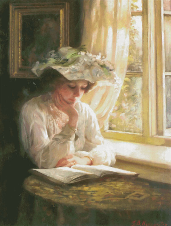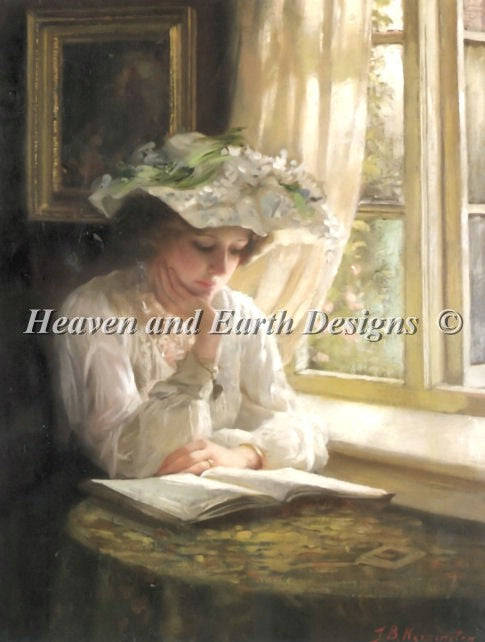 Lady Reading By Window Cross Stitch Pattern by Heaven and Earth Designs, Artwork by Thomas Benjamin Kennington.
