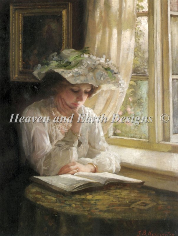 Mini Lady Reading By Window Cross Stitch Pattern by Heaven and Earth Designs, Artwork by Thomas Benjamin Kennington.