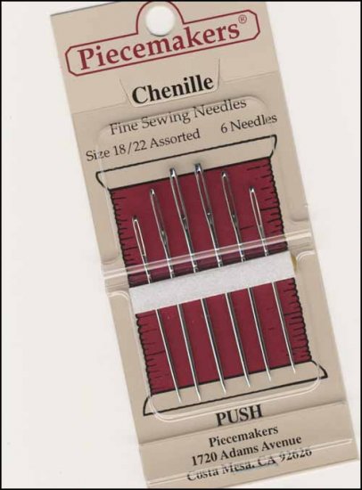 Piecemakers Chenille Needles are similar in length to tapestry needles but feature a sharp point and larger eye, making them perfect for crewel work, #3 or #5 perle cotton, quilt tying, candlewicking, and coarse fabrics. Each card includes six needles: two each in sizes 18, 20, and 22.