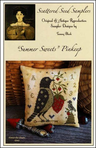 Summer Sweets Pinkeep Cross Stitch Pattern by Scattered Seed Samplers, Original & Antique Reproduction Sampler Designs by Tammy Black.