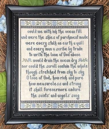 The Love of God counted cross stitch pattern model stitched on 28 ct Country French Linen, Latte with threads by The Gentle Art™